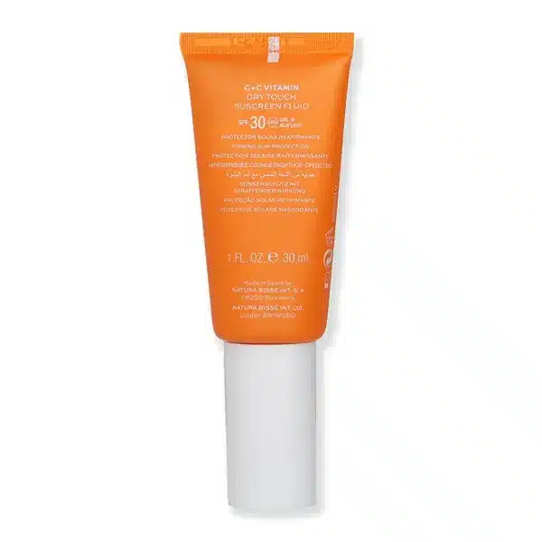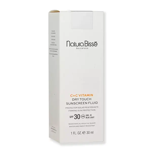 C+C Vitamin Spf30 Dry Touch Sunscreen Fluid de Natura Bissé es un fotoprotector antiedad de uso diario que protege la piel frente a los rayos UVA/UVB y la luz azul, mientras previene el envejecimiento prematuro y refuerza la firmeza cutánea. Su fórmula incorpora vitamina C y activos reafirmantes que combaten visiblemente los signos del fotoenvejecimiento: manchas, arrugas y pérdida de elasticidad.