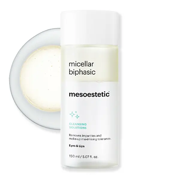 Micellar Biphasic Mesoestetic es un desmaquillante bifásico de alta tolerancia para ojos y labios que retira de forma suave suciedad y maquillaje, incluso water proof, sin dejar residuo graso.